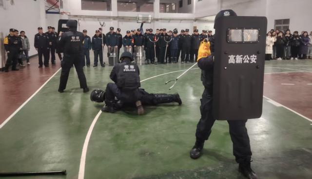 为进一步加强校园治安保卫重点单位安防能力建设,有效防范和稳妥处置涉校案事件发生,保障广大师生人身安全,2月22日上午,学校联合属地公安、消防等部门开展了校园“最小应急单元”实战演练。此次演练有高新派出所副所长张宝翰、民警陶珂,消防宣传员王江辉、王锦涛、李强等,学校保卫处全体人员、在校值班老师代表以及保安人员共120人参加。