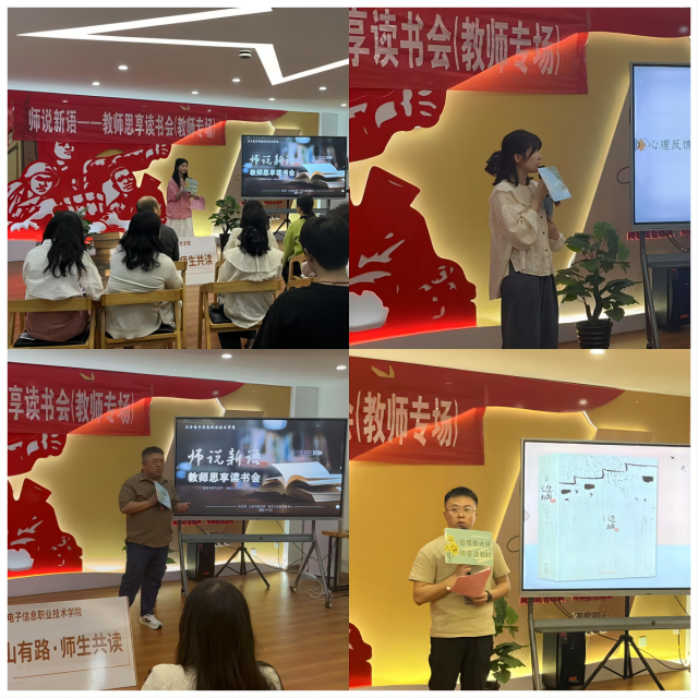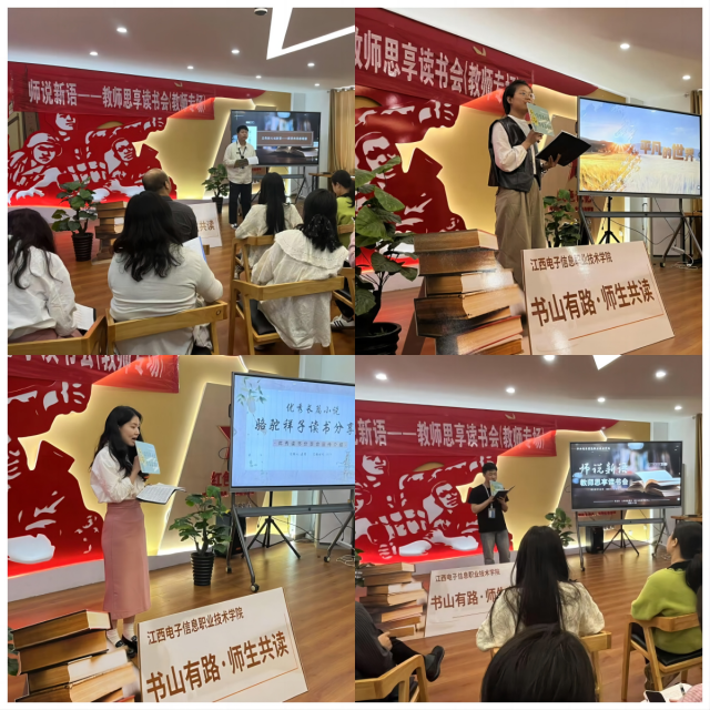 4月23日世界读书日,学校团委、公共课教学部、图书与档案管理中心联合举办“书山有路·师生共读”读书月教师专场活动——“师说新语”教师思享读书会。本次活动以教师为主体,14位教师携经典书籍登台分享,20名学生代表现场观摩,共同开启了一场跨越时空的思想对话与心灵共鸣。