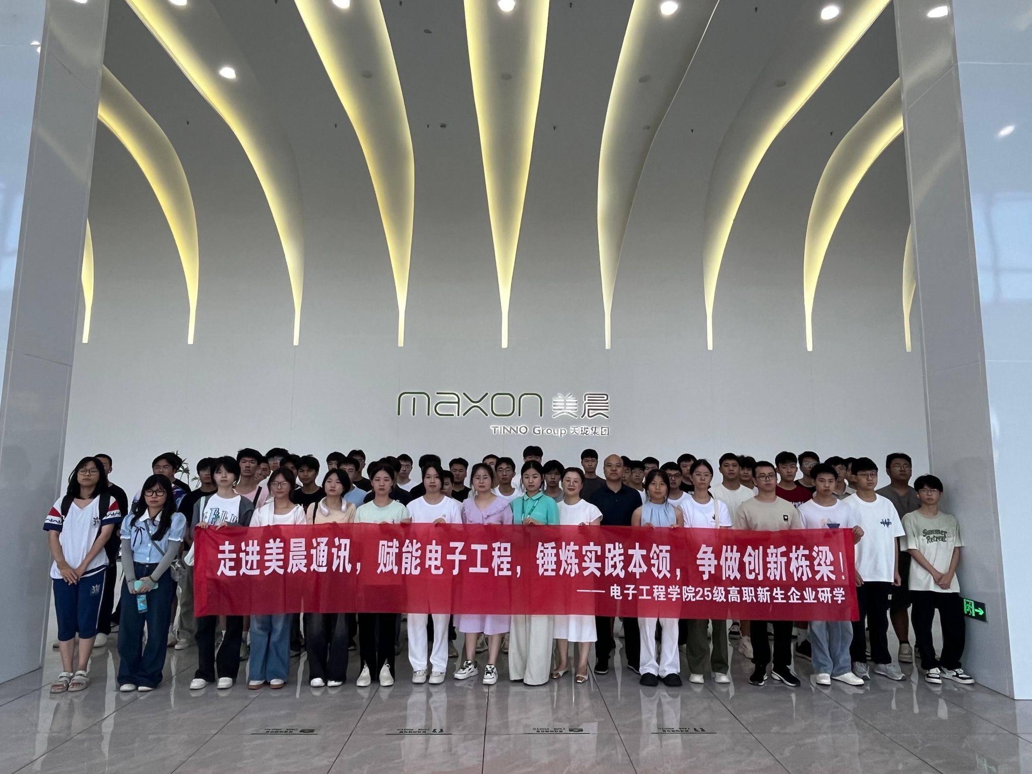 参观尾声,同学们在企业标志性的弧形灯光背景前合影留念,红色横幅上“走进美晨通讯,赋能电子工程,锤炼实践本领,争做创新栋梁!”的标语,正是此次研学价值的最佳注脚。
