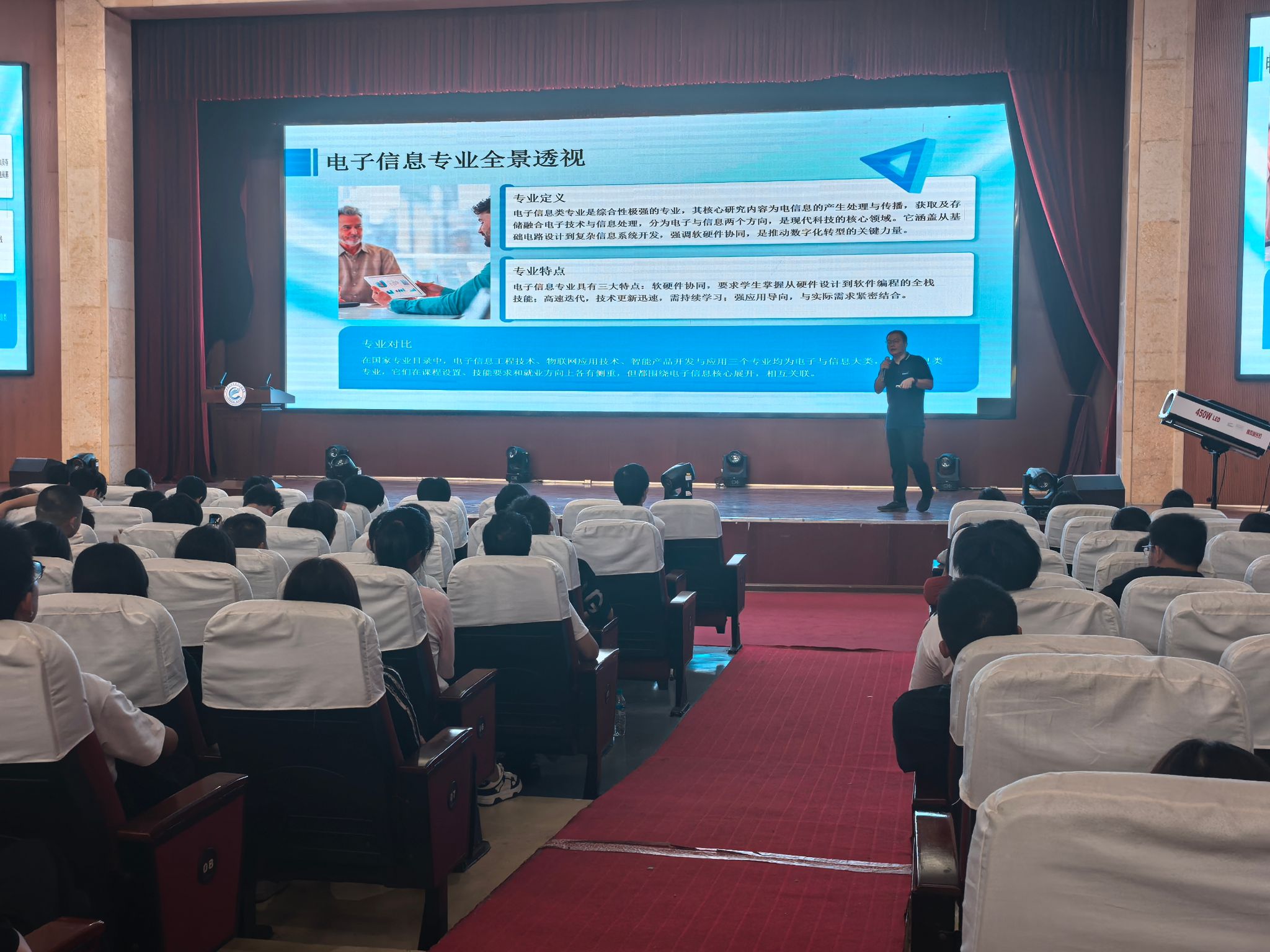 首先,学院负责人以“AI赋能成长之路”为主题,为新生们开启了大学专业第一讲。他深入浅出地阐述了电子信息类专业作为现代科技核心领域的综合性、应用性及广阔前景,强调了其“软硬件协同”、“高速迭代”和“应用导向”的鲜明特点,为新生描绘了一幅清晰的职业发展蓝图,坚定了大家的专业信心。