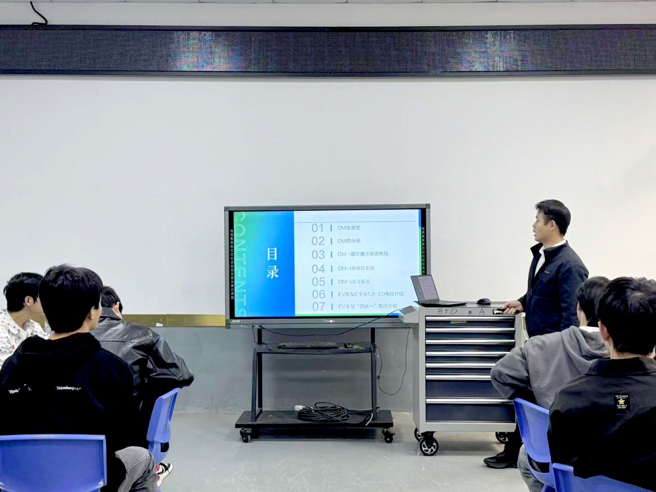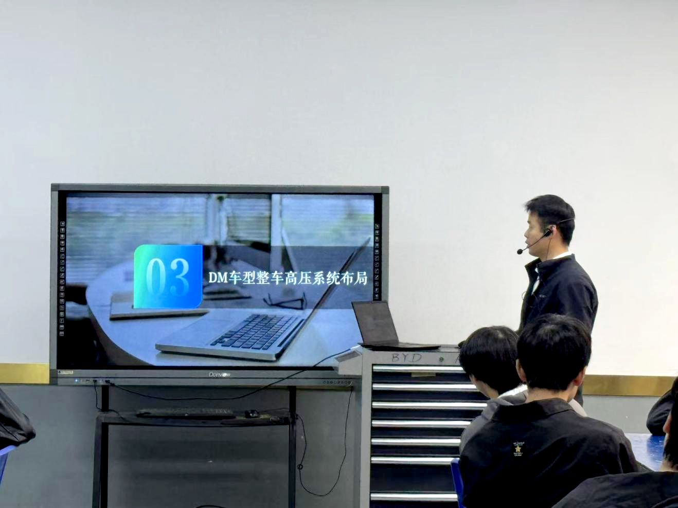 课堂上,李冬冬工程师充分展现出扎实的专业功底和丰富的实践经验。他以比亚迪DM发展史及分类为切入点,生动讲述了比亚迪混动技术在不同阶段的发展特点与创新突破,让同学们对比亚迪混动技术的演变有了清晰脉络。接着,他深入到DM-i整车高压系统布局,细致讲解了各个部件的功能和相互协作原理,使学生们对高压系统有了更为直观和深刻的认识。